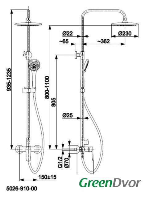 | Диаметр (ширина) верхнего душа | 230 мм |