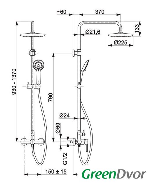 | Диаметр (ширина) верхнего душа | 225 мм |
