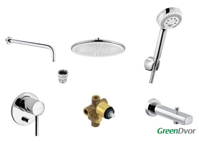 | Комплектация | верхний душ, ручной душ (лейка), держатель лейки, шланг, смеситель, излив для ванны |