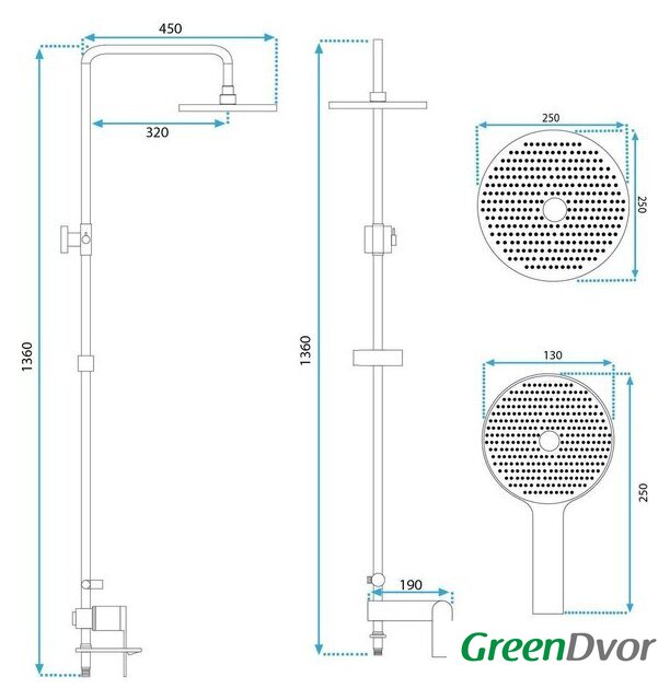 | Комплектация | верхний душ, штанга, ручной душ (лейка), держатель лейки, шланг, смеситель, излив для ванны |