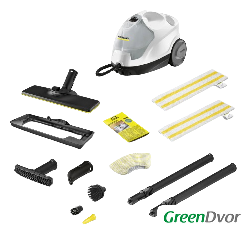 | Дополнительные насадки и приспособления | - Универсальная салфетка для пола EasyFix: 2 шт.- Микроволоконная обтяжка для ручной насадки: 1 шт.- Порошковый антинакипин: 3 шт.- Точечное сопло- Ручная насадка- Мощное сопло- Малая круглая щетка (черная): 1 шт.- Большая круглая щетка- Насадка для пола: EasyFix- Удлинительные трубки (2 × 0,5 м)- Накладка для освежения ковров |