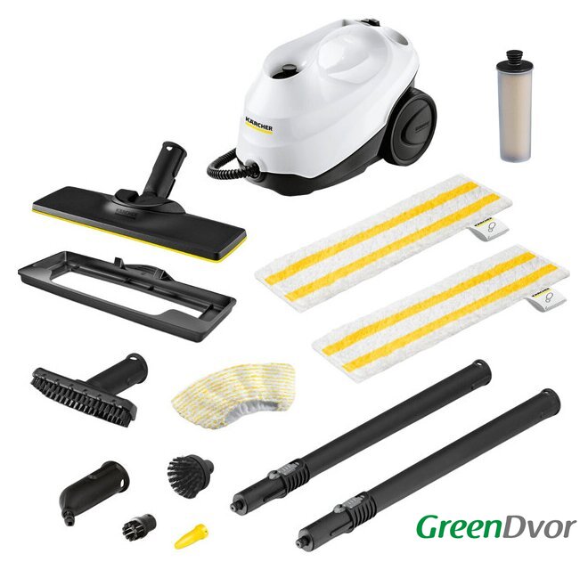 | Дополнительные насадки и приспособления | Универсальная салфетка для пола EasyFix: 2 шт.Микроволоконная обтяжка для ручной насадки: 1 шт.Картридж для защиты от накипи.Точечное сопло.Ручная насадка.Мощное сопло.Малая круглая щетка (черная): 1 шт.Большая круглая щетка.Насадка для пола: EasyFix.Удлинительные трубки (2 × 0,5 м).Накладка для освежения ковров. |