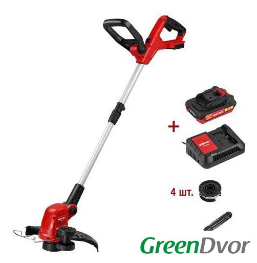 Аксессуары | - Аккумуляторная батарея - 1 шт.- Зарядное устройство - 1 шт.- Дополнительная рукоятка- Катушка под леску (установлена)- Катушка с леской - 4 шт.- Защитный кожух- Кромочное колесо- Предохранитель- Винт- Отвертка- Паспорт- Упаковка |