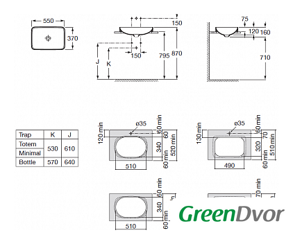 55x37 см, чаша, накладной, крепление на столешницу