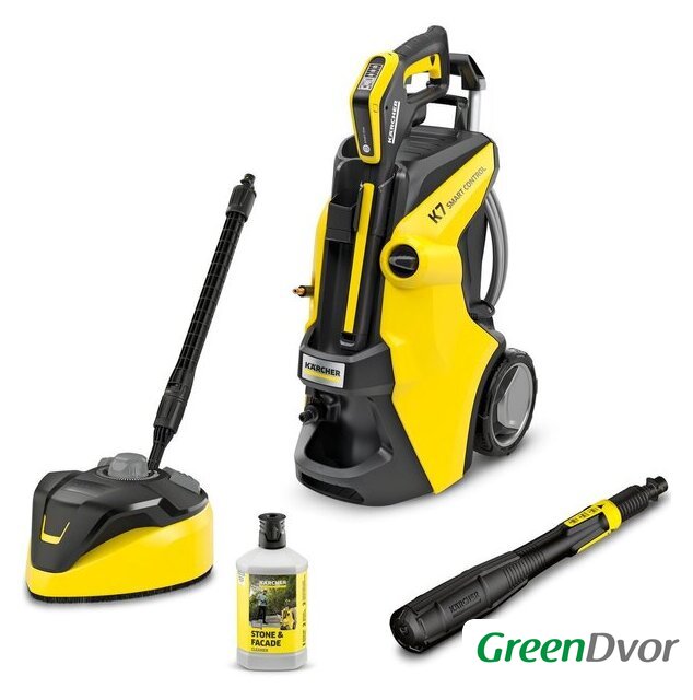 Комплектация | - Домашний комплект: очиститель поверхности T 7, очиститель камня и фасада, 3 в 1, 1 л;- Пистолет высокого давления: G 180 Q Smart Control;- 3 в 1 Multi Jet;- Шланг высокого давления: 10 м, PremiumFlex;- Адаптер для соединителя садового шланга A3/4". |