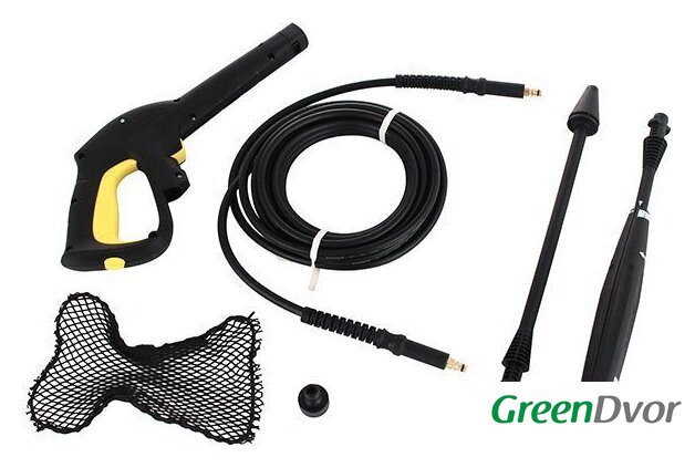 Комплектация | - Пистолет, стандартный (Quick Connect);- Струйная трубка Vario Power;- Грязевая фреза;- Шланг высокого давления, 8 м;- Разъем Quick Connect на корпусе аппарата;- Система подачи чистящего средства, всасывающая трубка;- Телескопическая ручка;- Двигатель водяного охлаждения;- Встроенный фильтр для воды;- Адаптер для садового шланга A3/4". |