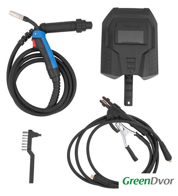 Комплект поставки | - сварочный щиток;- молоток-щетка;- горелка АК15 с евроразъемом 3м;- кабель заземления 1.2м;- 2 наконечника для сопла горелки (0.6 и 0.8 мм). |