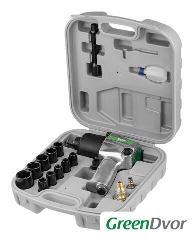 Комплектация | ПневмогайковертСменные головки 1/2" - 10 штУдлинитель 1/2" на 125 ммМини масленкаКлюч шестигранный на 5 ммНиппельМасло для пневмоинструментаПластмассовый чемодан |